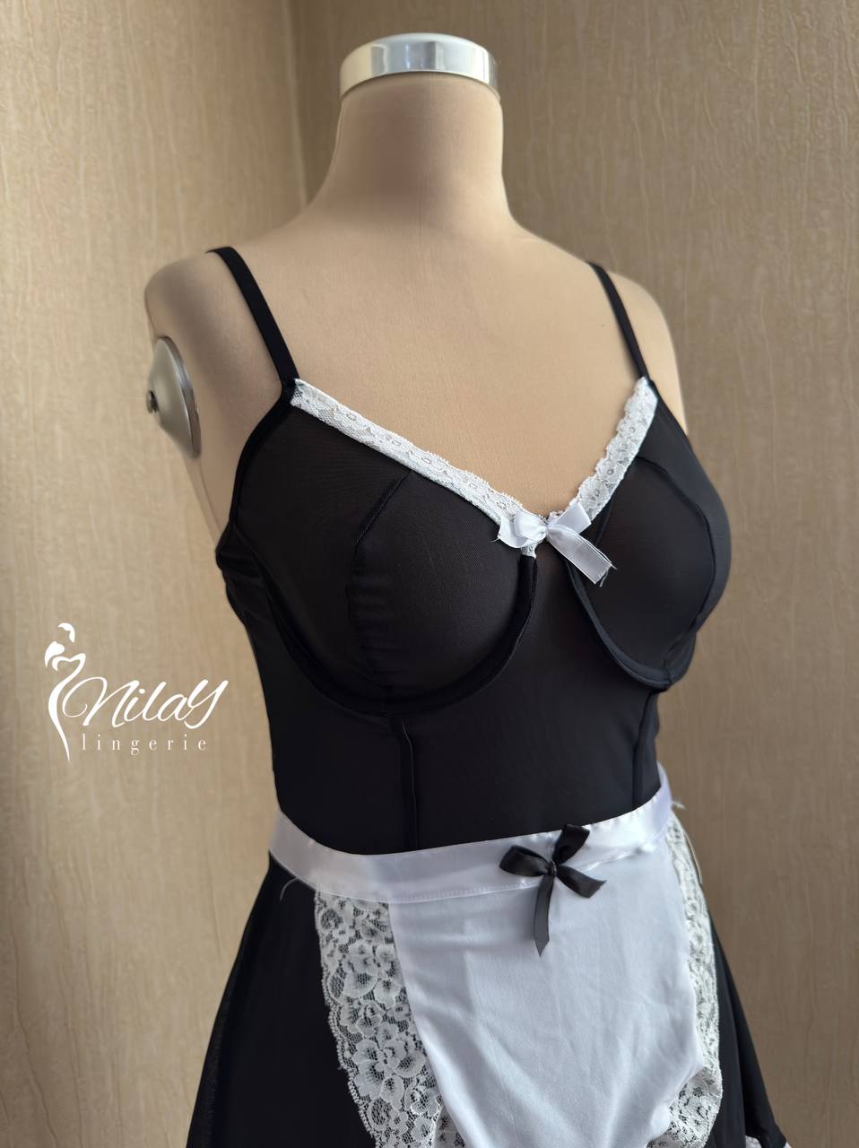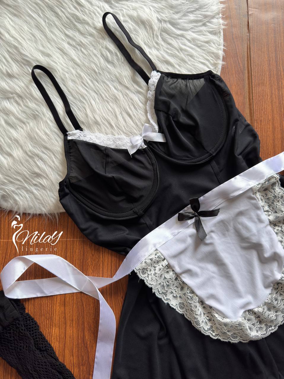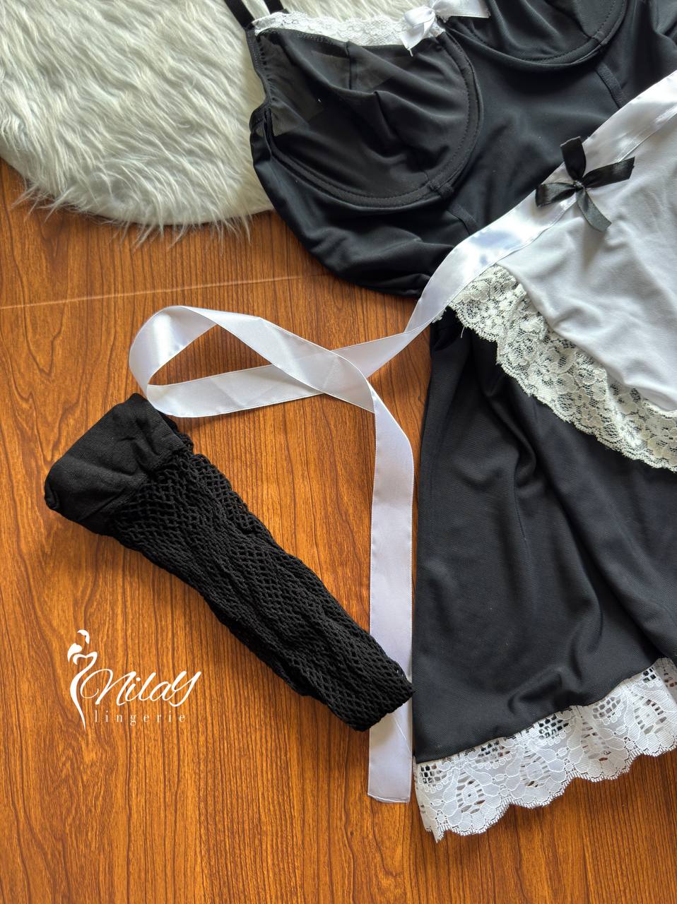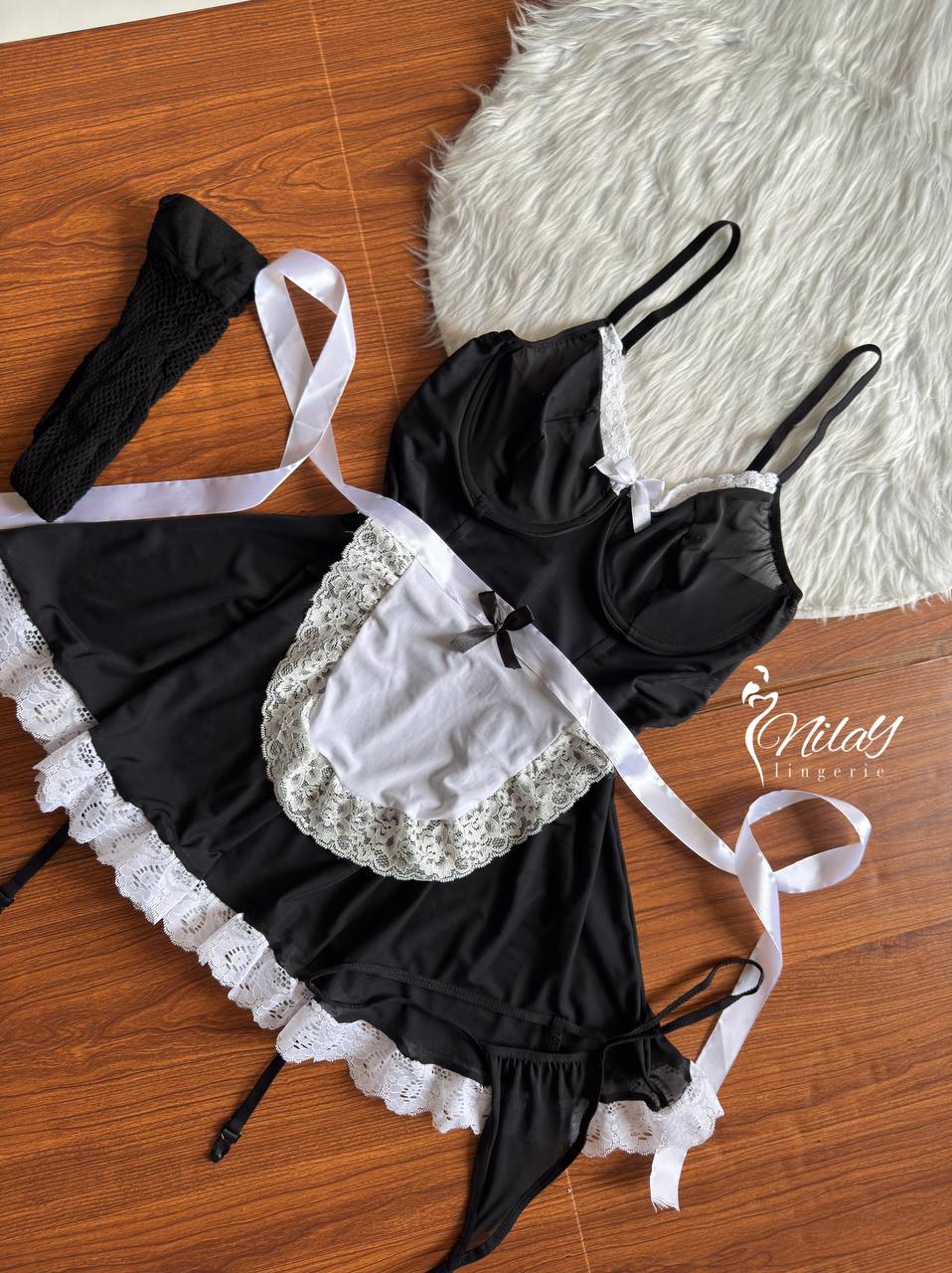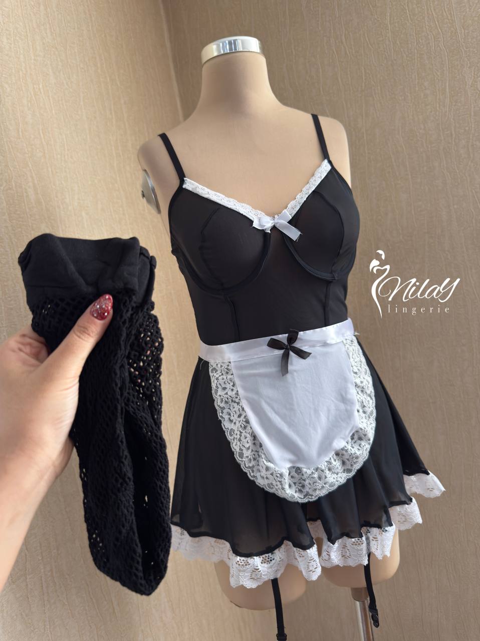 کاستوم خدمتکاری فانتزی 😍 ست چهار تیکه فانتزی کاپ فنردار تک رنگ کیفیت عالییی جوراب بالا زانو فیشنت زنبوری سایزبندی: لارج ، ایکس لارج لارج از 38,40 ایکس لارج 42,44