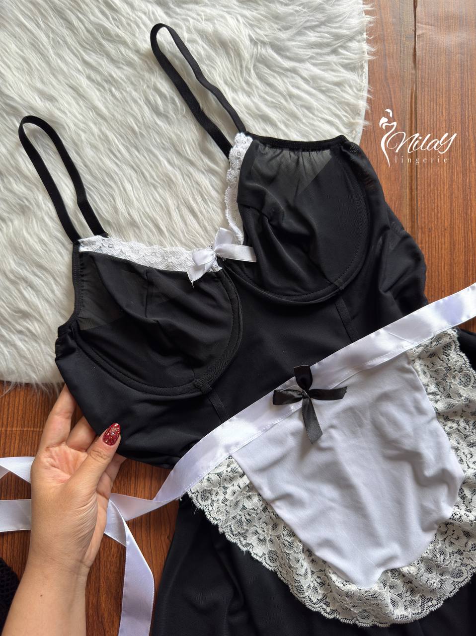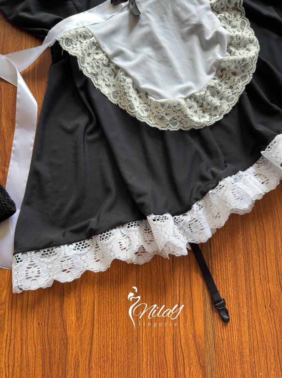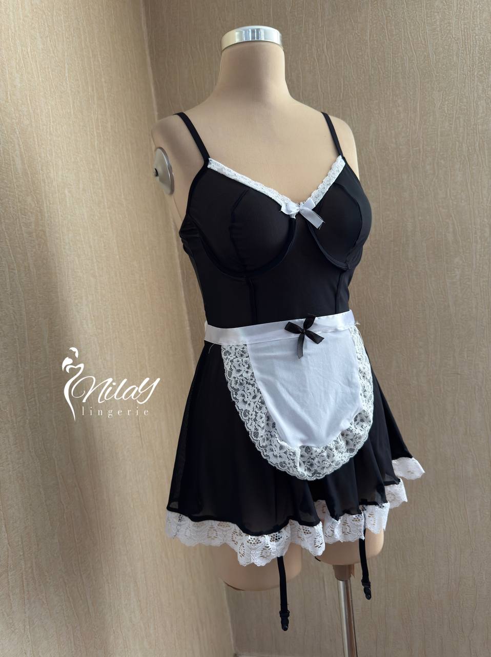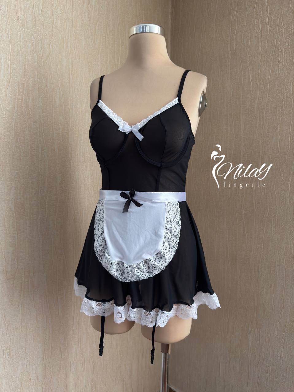کاستوم خدمتکاری فانتزی 😍 ست چهار تیکه فانتزی کاپ فنردار تک رنگ کیفیت عالییی جوراب بالا زانو فیشنت زنبوری سایزبندی: لارج ، ایکس لارج لارج از 38,40 ایکس لارج 42,44