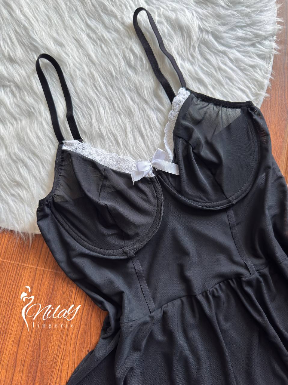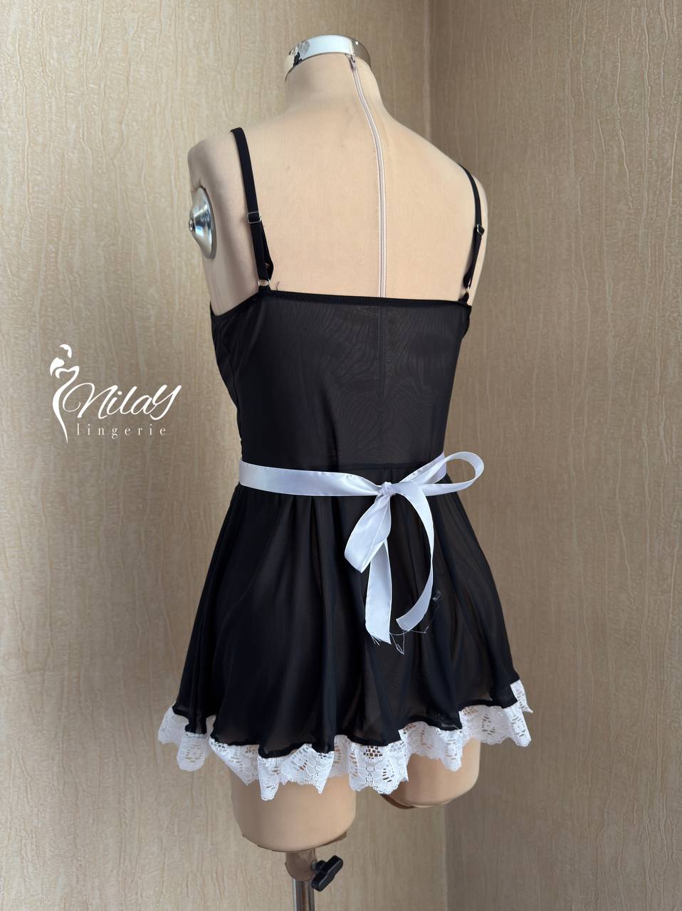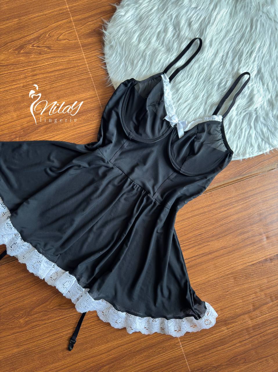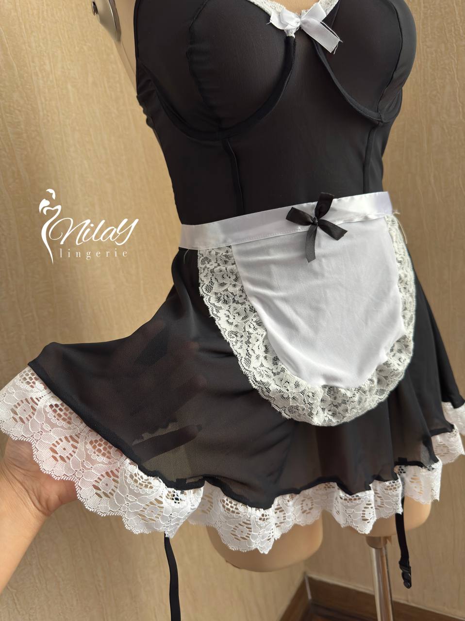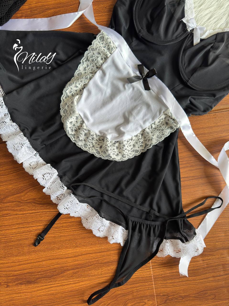 کاستوم خدمتکاری فانتزی 😍 ست چهار تیکه فانتزی کاپ فنردار تک رنگ کیفیت عالییی جوراب بالا زانو فیشنت زنبوری سایزبندی: لارج ، ایکس لارج لارج از 38,40 ایکس لارج 42,44